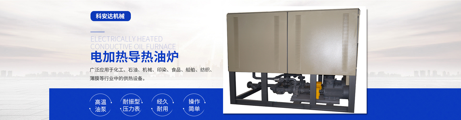 近年來我公司在延用自己的技術(shù)基礎(chǔ)上不斷引進先進技術(shù)與管理經(jīng)驗,專業(yè)研發(fā)制造電加熱導熱油爐(有機熱載體爐)、電磁感應加熱器、電加熱爐、熱風循環(huán)箱式預熱爐、風道加熱器、空氣加熱罐、電加熱管、高溫電阻爐、保溫烘箱、烘道、鑄鋁鑄銅加熱器、防爆加熱器、遠紅外加熱管、埋入式遠紅外陶瓷加熱瓦、陶瓷加熱圈、不銹鋼云母電熱圈、碳化硅遠紅外電加熱板、電熱帶 、真空清洗爐、三甘醇清洗爐等。產(chǎn)品適用于化纖、紡織、皮革、塑料機械、電纜機械、食品機械、橡膠機械、冶金、石油、化工、電子、醫(yī)療、海洋工程、家用電器等行業(yè)。同時可根據(jù)客戶使用與現(xiàn)場安裝的需要,設計、制造特殊規(guī)格的上述設備,企業(yè)以其先進技術(shù)、合理的價格,周道的服務使產(chǎn)品遠銷國內(nèi)外。